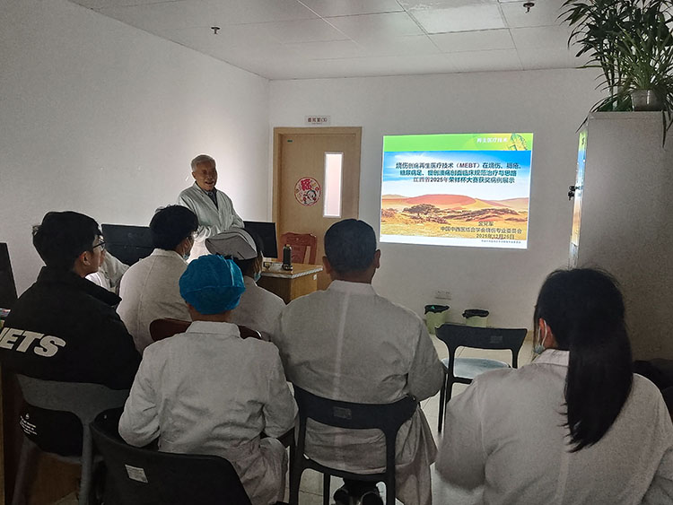 1月15日,应信丰县中医院手足创面修复外科黄主任邀请,北京荣祥再生医学研究所副所长、《中国烧伤创疡杂志》编委、烧伤创疡再生医疗技术临床专家金党军主任来到该院,为医护人员培训再生医疗技术在烧伤、压疮、糖尿病足、慢性溃疡等慢性创面临床上的规范使用,并展示了2025年江西地区湘赣第七届“荣祥杯”优秀病例。培训结束后,金主任与医护人员一起为多例慢创患者会诊并亲自示范规范换药,就后续治疗与经管医生深入交流并提出指导意见,赢得在场患者家属和医护人员的一致好评。会诊结束后,金主任还与黄主任就科室建设与发展进行了深入交流。下午,金主任前往信丰县人民医院胸外创面修复科,与何医生负责的慢创病例进行交流并提出后续治疗指导意见。