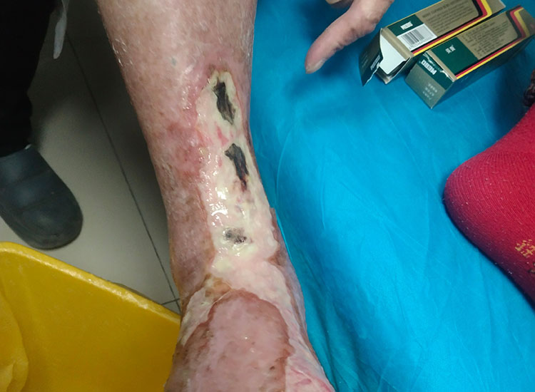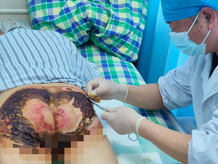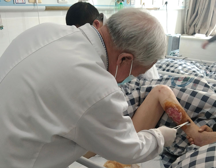 3月5日,《中国烧伤创疡杂志》常务编委、烧伤创疡再生医疗技术临床专家赵瑞庆教授应同煤二医院急会诊邀请,当日会诊处置一例右下肢广泛深筋膜感染女性老年患者。事后,赵教授还检视了九例正在接受再生医疗技术治疗的患者(包括糖足3例、压疮4例、截肢术后残余创面1例、右股外感染创面1例),并在总结环节对住院患者进行了详细的治疗安排。