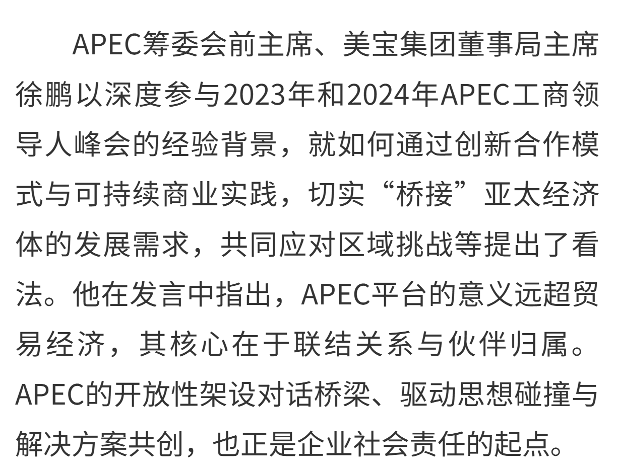 近日,亚太经合组织(APEC)2025年系列活动前奏路演在京举行。连续三届担任 APEC 战略合作伙伴,美宝集团深度参与亚太经济规则共建和资源共享,积极践行"传承、合作、进步"的APEC核心精神。